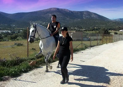 Κατά τις πρώτες 'εξόδους', ο Εκπαιδευτής συνοδεύει τον έφιππο μαθητή του πεζή και σε ετοιμότητα για την πρόληψη του οποιουδήποτε απροόπτου!
