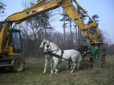 Και η αμαξηλασία του "μαέστρου" Διευθυντού έγινε ακόμη πιό συναρπαστική όταν, καθ' οδόν, συναντήσαμε μία ...μπουλντόζα με διατρητικό "δόντι" να τρυπά, κάπου, το έδαφος. Ο Αμαξηλάτης πλησίασε, έθεσε τα Lipizzaner ακριβώς κάτω από τον ολοκίτρινο ατσάλινο βραχίονα και ζήτησε από τους εργάτες να τον περιστρέψουν γύρω από την άμαξά μας! Η θορυβώδης μηχανοκίνητη "αψίδα" γύρισε δυό-τρεις φορές πάνω από την άμαξα και τα Lipizzaner μας χωρίς τα τελευταία να δείξουν την παραμικρή ενόχληση!